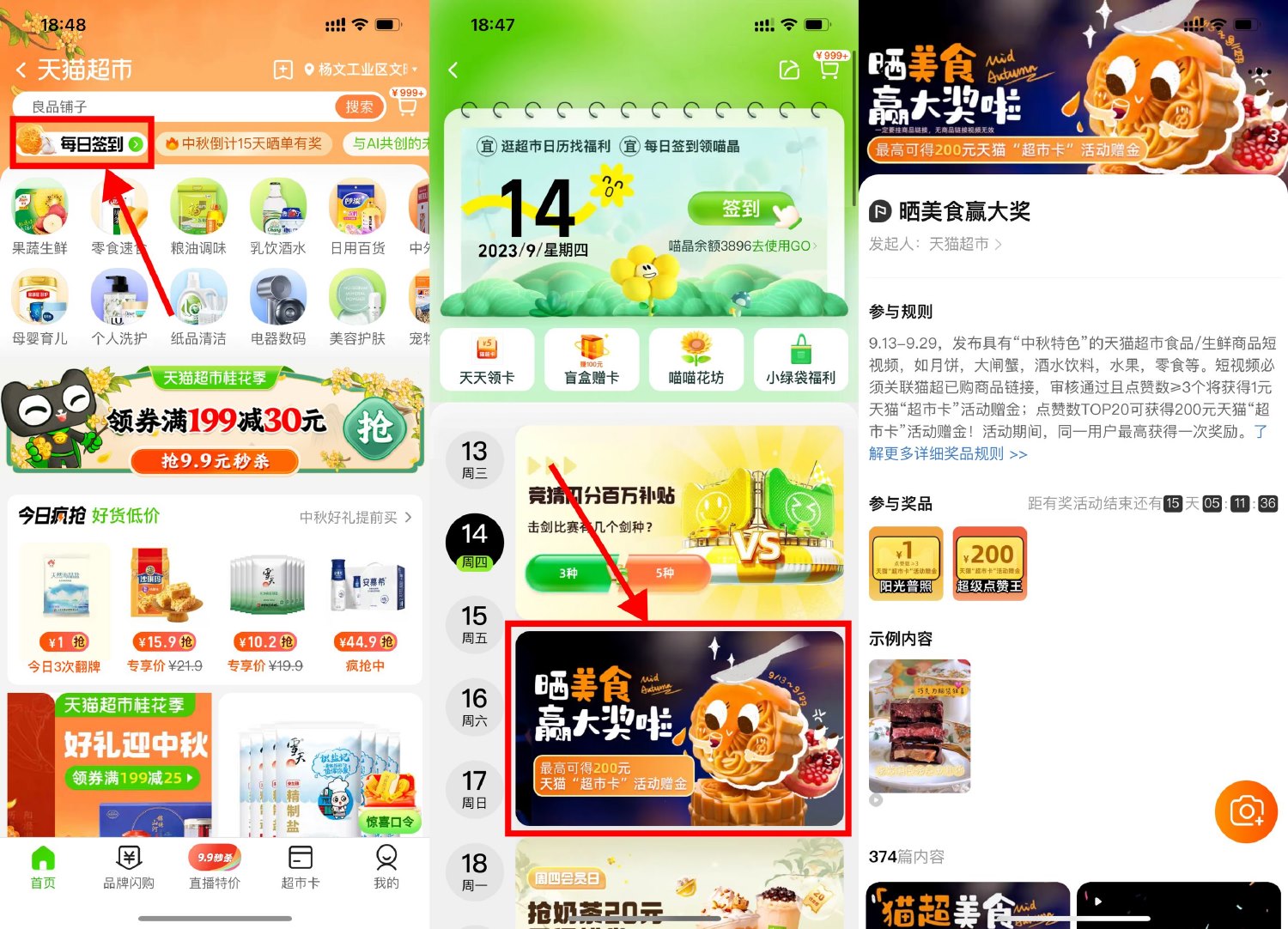 1、淘宝首页“天猫超市”->左上角“每日签到”->下拉点晒美食的横幅进入