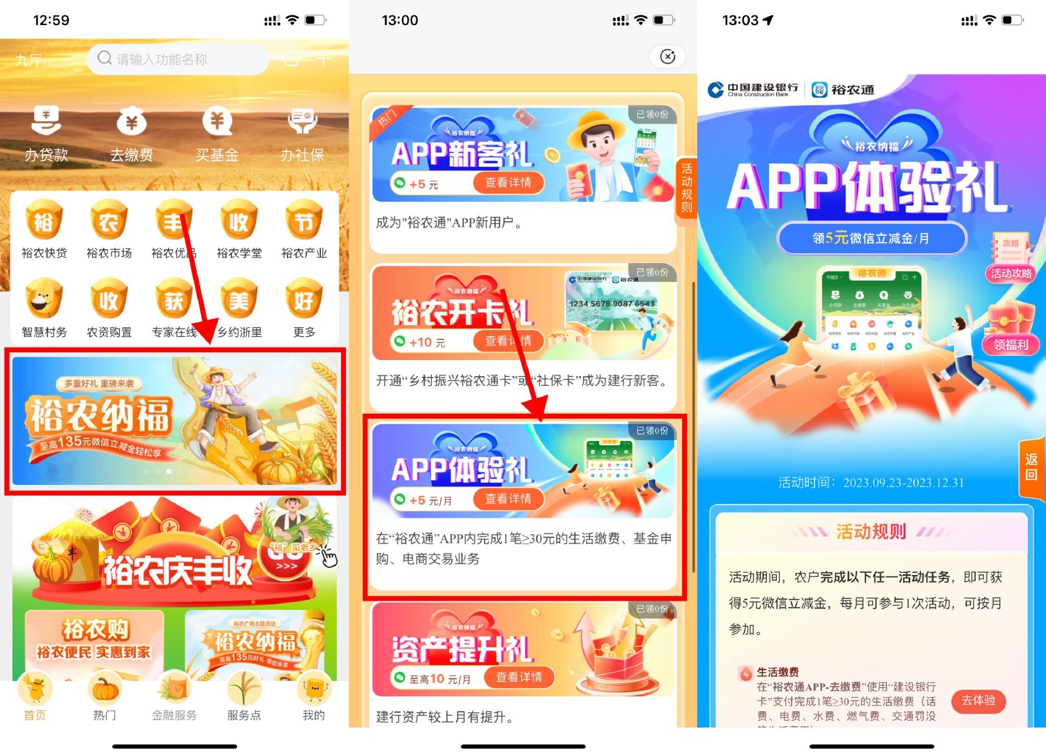1、应用商店下载“裕农通”APP->轮播图“裕农纳福”->APP体验礼 2、跳转到建行去充水电费30亓领5元立减金...