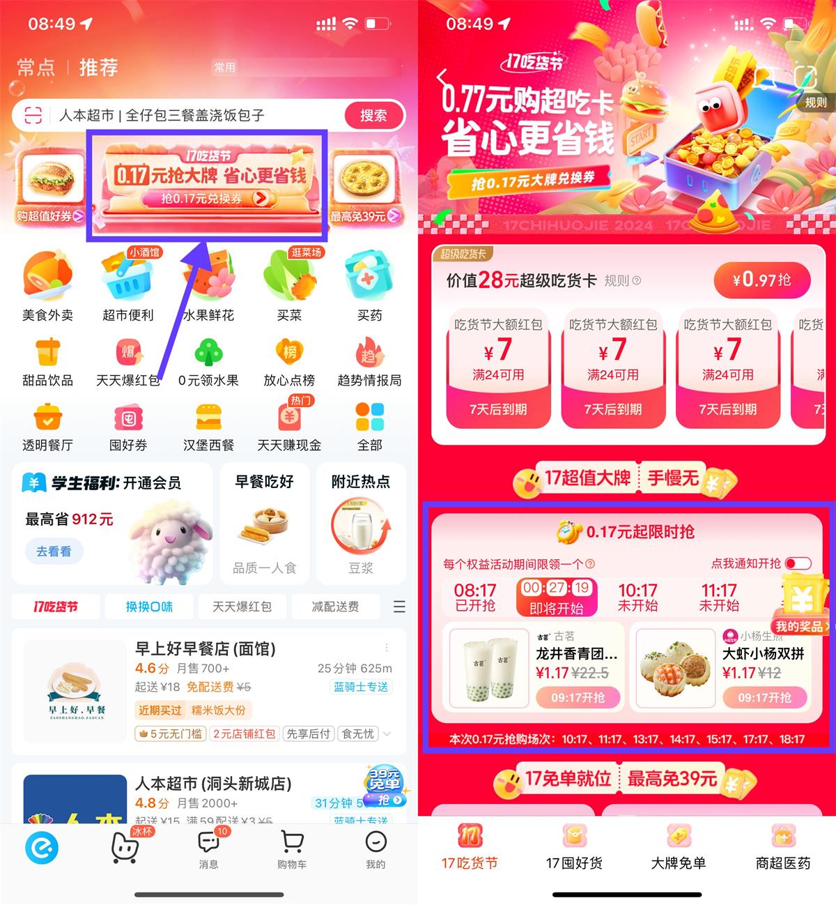 饿了么APP首页“17吃货节”->每个整点的17分,低价抢大牌美食,自己去蹲!