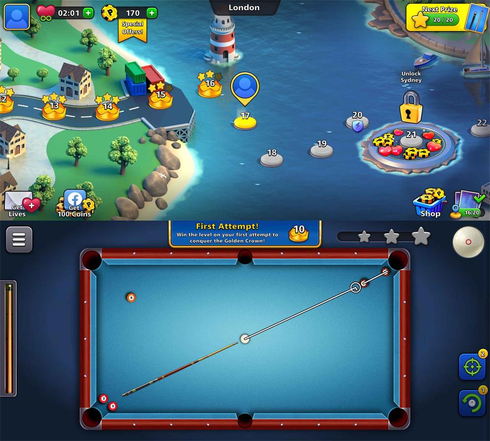 8球台球技巧是一款休闲台球闯关游戏。精致的游戏画风,逼真的物理引擎,真实还原台球运动轨迹和碰撞效应,考验你的预判和决断能力,已去除广告。